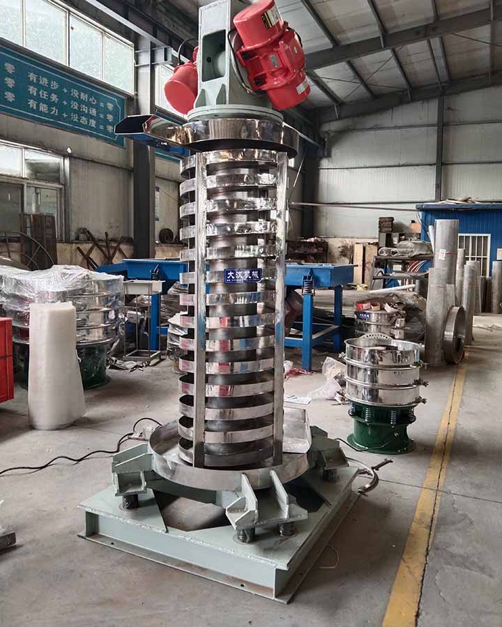 DZC系列垂直振動提升機的驅動裝置振動電機安裝在輸送塔下部,兩臺振動電機對稱交叉安裝,輸送塔由管體和焊接在管體周圍的螺旋輸送槽組成,輸送塔座于減振裝置上,減振裝置由底座和隔振彈簧組成。當垂直輸送機工作時,根據(jù)雙振動電機自同步原理,由振動電機產生激振力,強迫整個輸送塔體作水平圓運動和向上垂直運動的空間復合振動,螺旋槽內的物料則受輸送槽的作用,作勻速拋擲圓運動,沿輸送槽體向上運動,從而完成物料的向上(或向下)輸送作業(yè)。