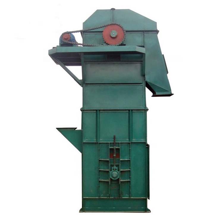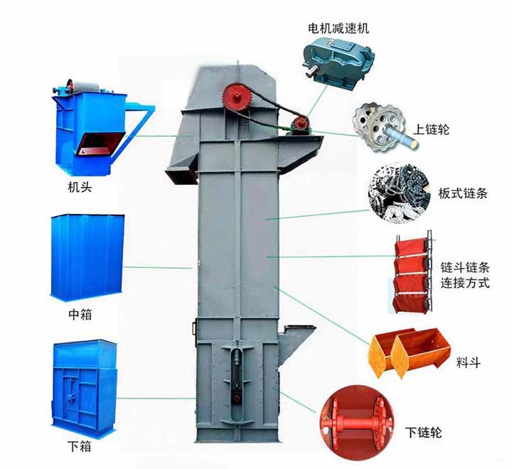 TD400型斗式提升機由三個大的部分組成,分別是機頭、中箱和下箱。機頭上面配有電機減速機和上鏈輪。機箱里面有板式鏈條、料斗和下鏈輪。通過電機的轉動帶動鏈條然后完成從下到上的輸送物料。