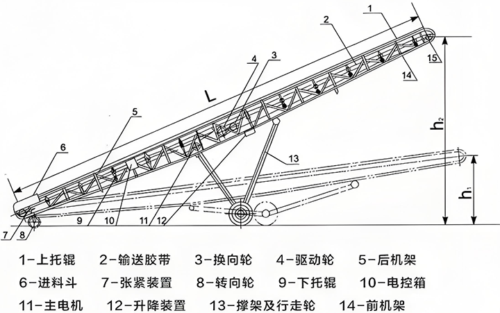 DY 型移動(dòng)式皮帶輸送機(jī)由驅(qū)動(dòng)、滾動(dòng)、托輥、清掃、卸料、制動(dòng)部分及罩殼、導(dǎo)料槽等附件構(gòu)成,各部分包含多種類型部件,驅(qū)動(dòng)裝置可左右裝并配不同參數(shù)電動(dòng)滾筒。